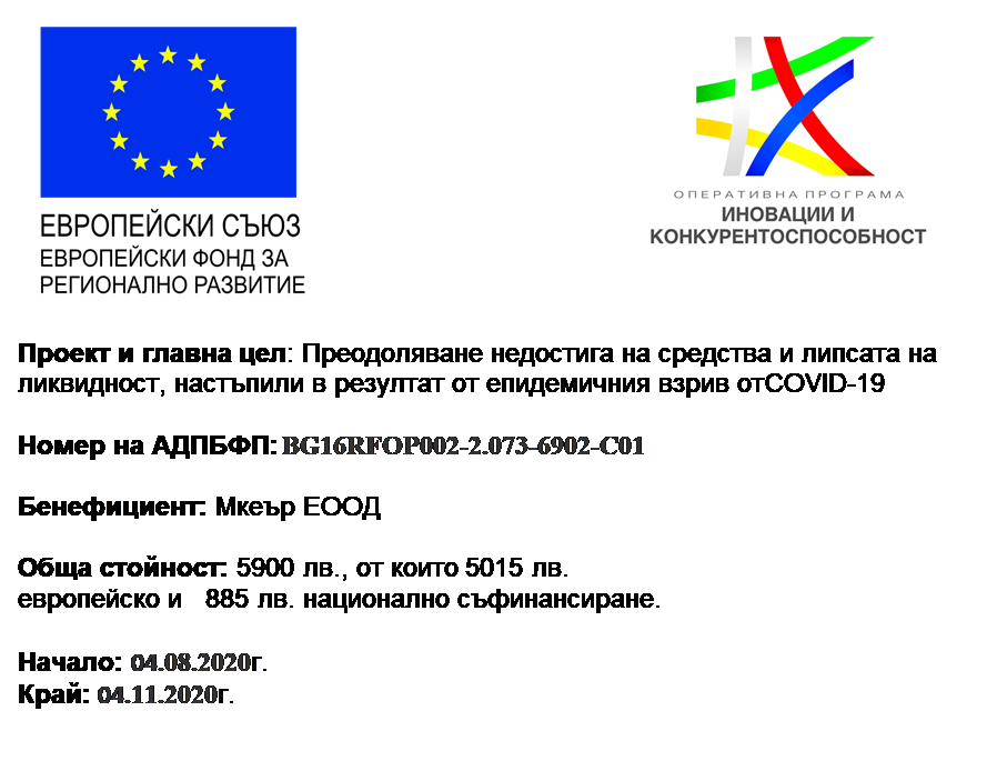 Мкеър ЕООД подписа договор BG16RFOP002-2.073-6902-C01 от 04.08.2020 г. за предоставяне на безвъзмездна финансова помощ с Министерство на икономиката, с предмет ...